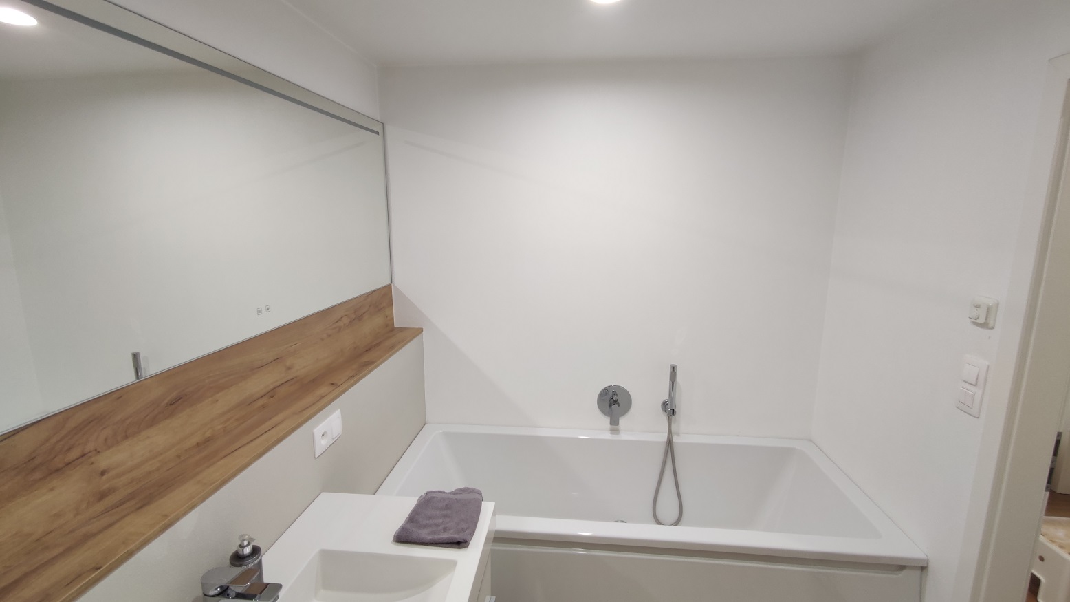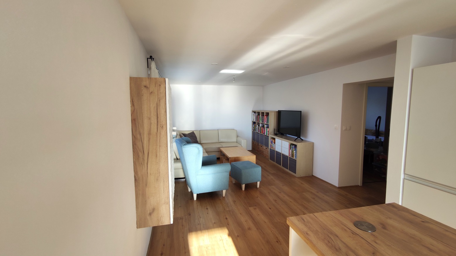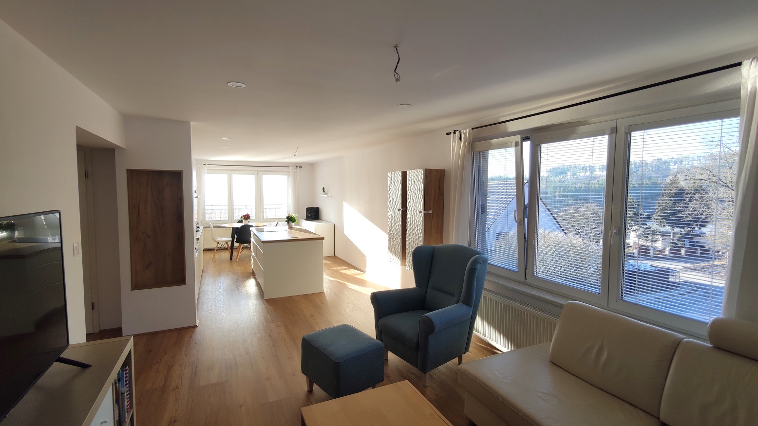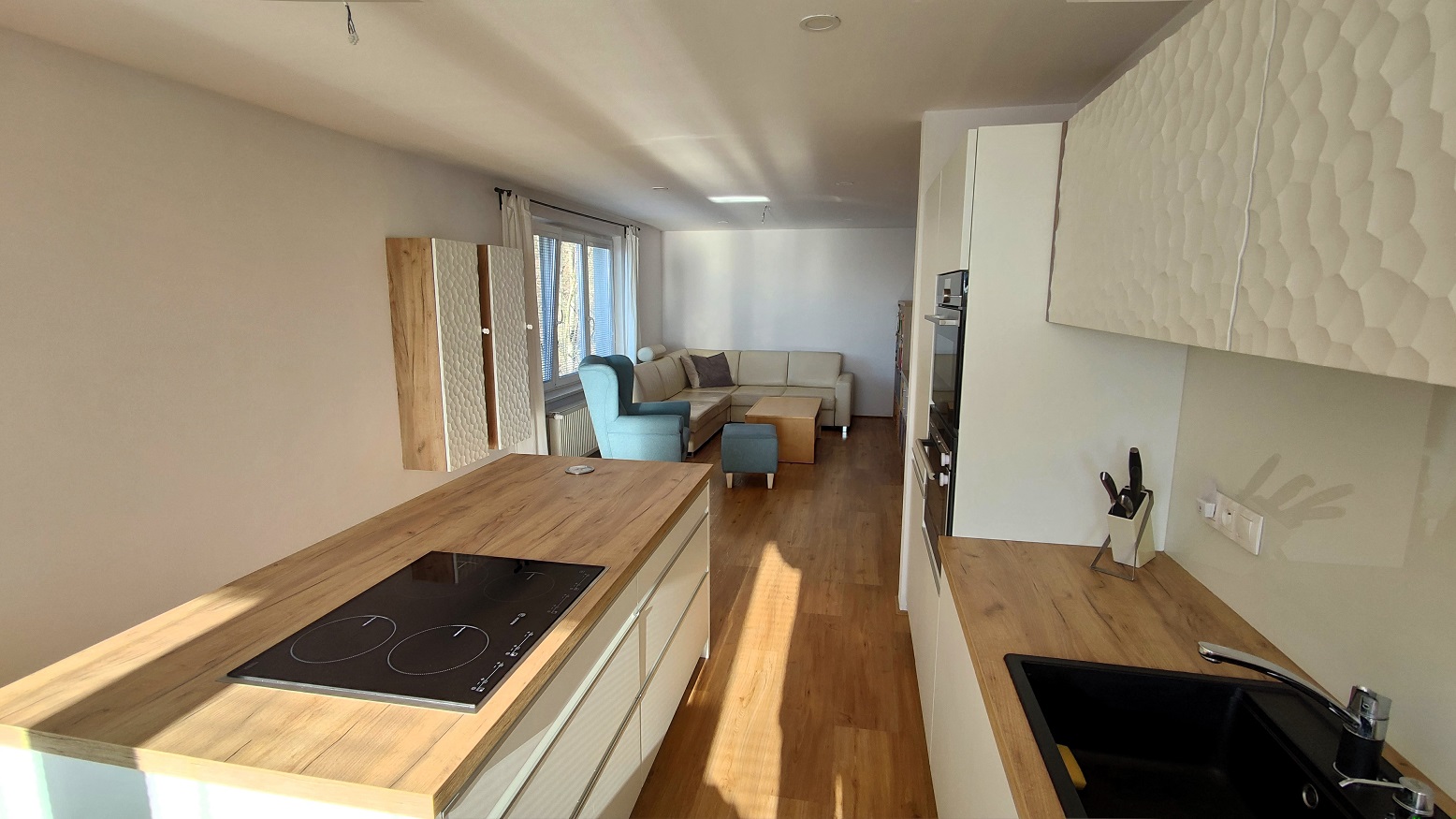 Kuchyňská linka s vestavěnými spotřebiči (chladnička, mraznička, parní trouba, klasická trouba, mikrovlnná trouba, myčka, indukční varná deska. V koupelně vana a sprchový kout, šatna s úložným systémem. Na chodbě před vstupem do bytu skříň včetně botníku. Vinylová podlaha click. Byt bude k dispozici v červnu.